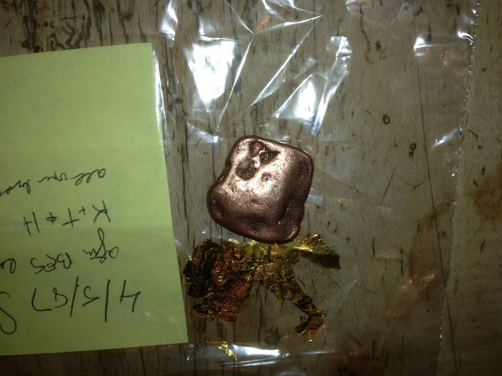 | Succesful Apportation linking into the focus object’s ‚gold-foil-systemic‘ and materializing a piece of pure copper, the foil is made of, as a result…! Done under fraud-proof conditions. |