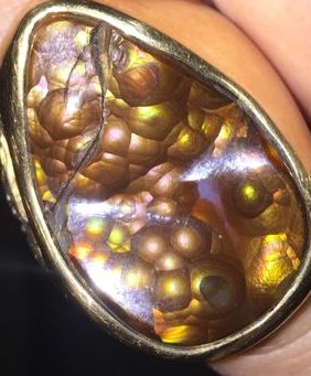 | The fire agate in this ‚rare and unique work‘ (jeweler) is a fascinating stone with an internal special fire, made from inner compounds that endanger it to break more easily, like the ‚opal‘ as well… |