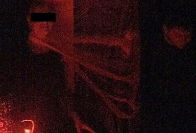 from the curtain on the left side and attached it to his wifes head and neck area, meanwhile at the same time it clinged to the curtains with strange like