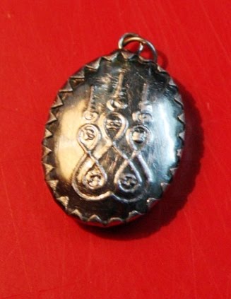 A second apport fell on the floor close to Steffi, and she had a personal communication from Hans Bender in connection with this. We were asked not to pick up the apports until the sitting was over. When we first saw the two objects, they both came from India. Steffi’s apport was a piece of jewellery and ours – from Winston – looked like a coin or medallion. On the front were depicted two (possibly Hindu) indian gods with – on the reverse – two symbols representing Alpha and Omega; the beginning and the end. Weren’t we lucky!!