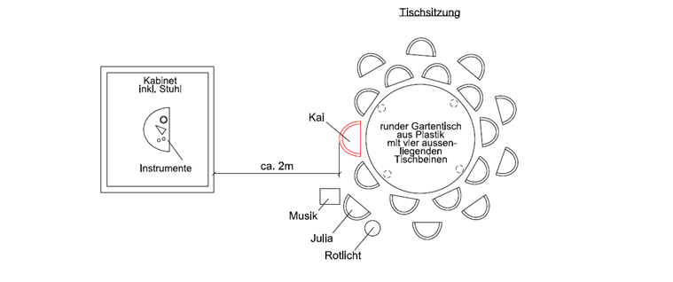 The séance itself is held – besides the red-light parts – in semi-darkness. The room is then illuminated only by some glowing focus objects. Partially total darkness is applied also!