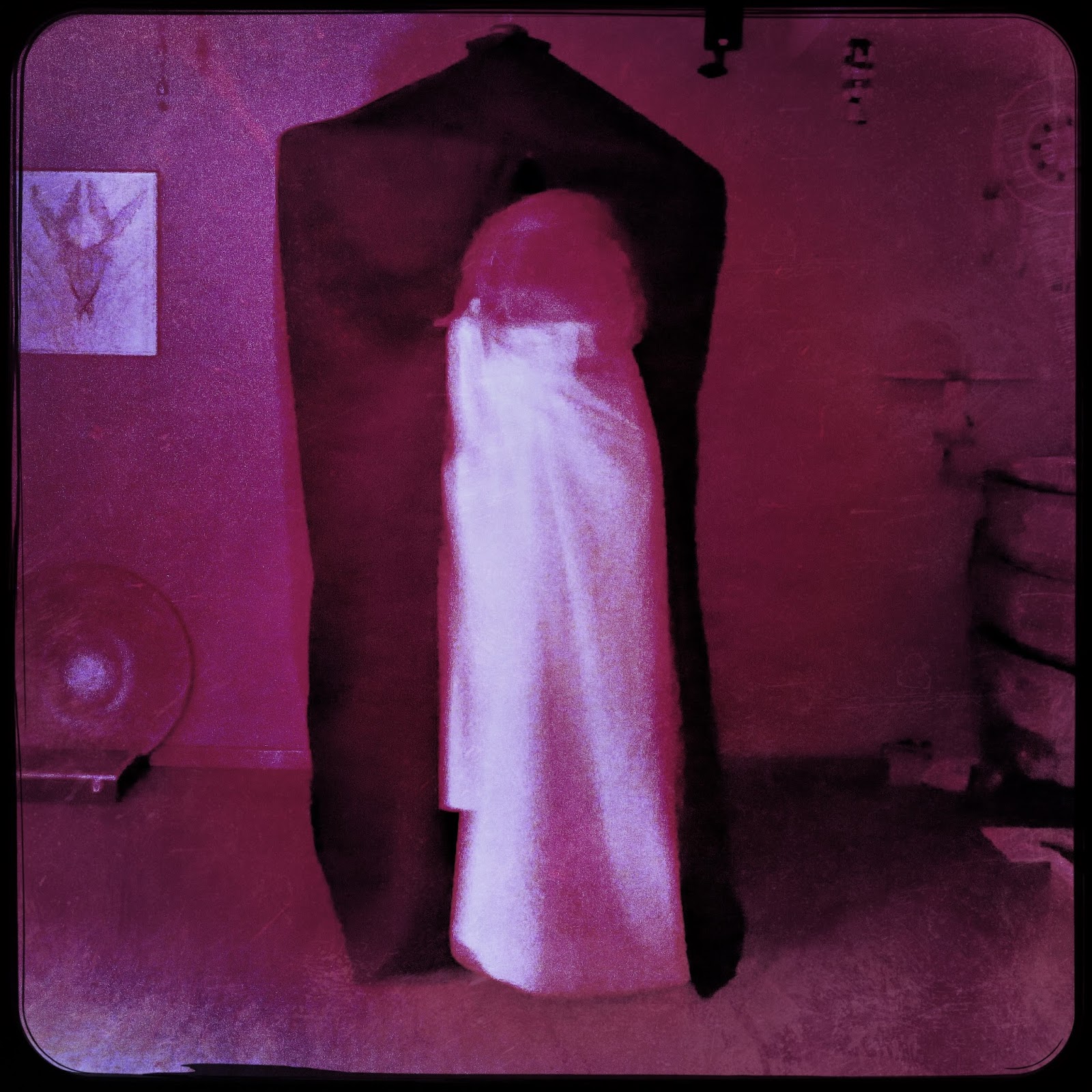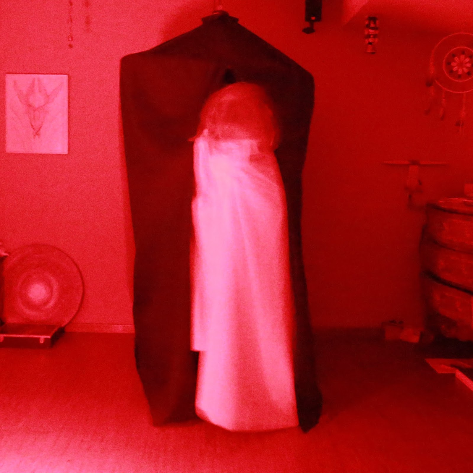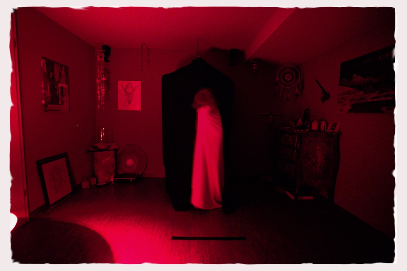Reluctantly a short and slim female with long hair started to exit the cabinet. Her head was exposed but when she exited and the red light fell on her, she lowered her head and covered her eyes from the red light. Her long, dark-blonde hair fell over her shoulders when she moved outside the both curtain halfs. Again a white garment of some sort was worn and i could see a slim arm under it. At the same time i was counting out loud to five. That’s quite a long time, although the camera, operated by M., only managed to shoot one photo. Focussing and a long blend were responsible.