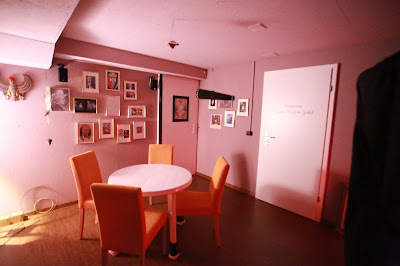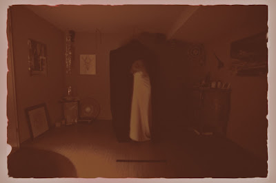 The bell rang again. Red light illuminated the room and i started to count. The narrow shouldered entity could now be seen standing in front of the curtain slits looking half right and avoiding the direct view into the red light. This was the only time her head was only sunken into her shoulders but looking straight towards my left! But because of her full hair from my/our position her face was covered and i could see her facial features only superficially.
