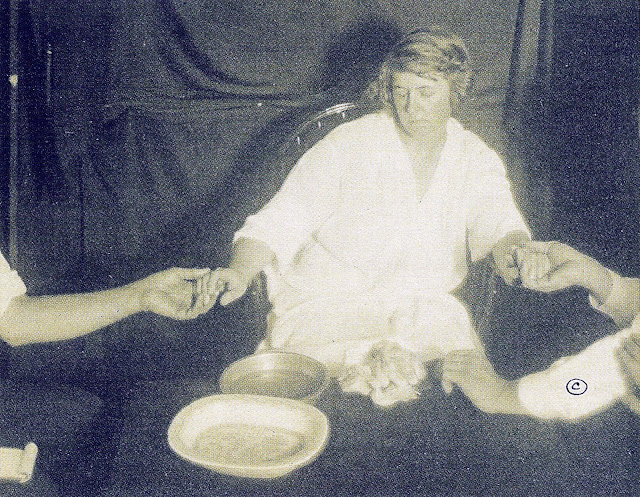Scientific test séance for the American Society for Psychical Research with Margery. From her lower body a hand emerges leaving in a piece of wax the fingerprints of Margeries deceased brother…