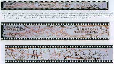 In particular the following film showing glyphs and some German words „Wie der Staub“ etc. was controlled by me in such a way that there was no doubt left at all: it was bought by us in a normal Foto Shop in Norwich, it has always been in our hands, before, during and after the sitting and it was in addition secretly marked by myself. There was no way to manipulate something and the result of the experiment was again magnificent.