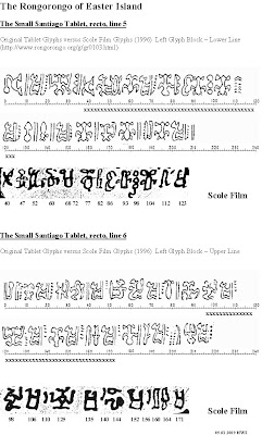 It was the homepage http://www.rongorongo.org/ that allowed us to find the glyphs. A big compliment to the operators of this site, it is a comprehensive coverage of all Easter Island glyphs and tablets and their background. We have used a few of their pictures to show the tablet to Scole film comparison.