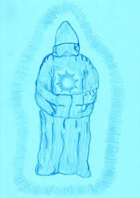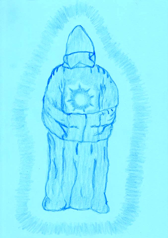 This bright light shining up I perceived located around the spirit materializations chest-belly area, in a way illuminating the figure from the inside and also the ‚outside‘ becoming clearly visible, sometimes keeping the arms sideways, sometimes with the arms folded at the front.