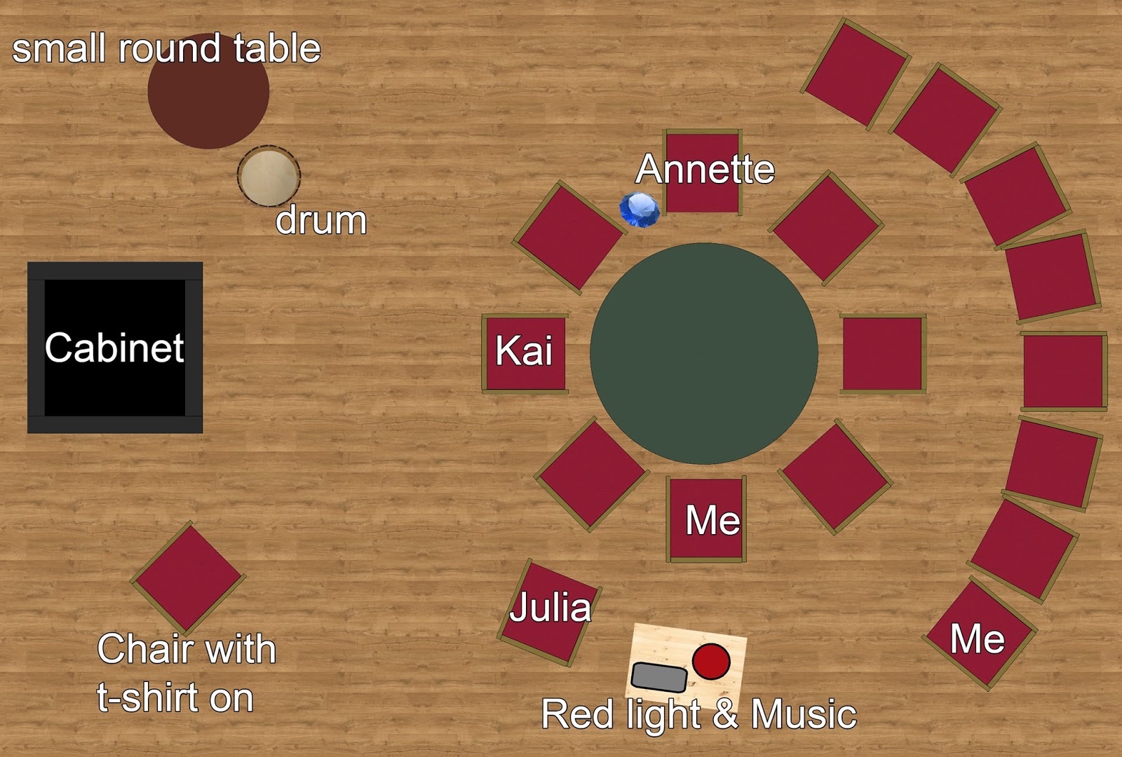 | Activation-Objects materialized in red light for the sitters. |
