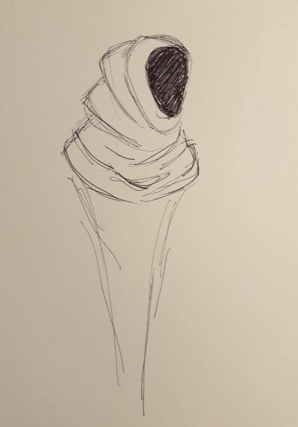 ‚It was an extremely thin figure. Under the cloth a head was visible. The shawl was folded around the head in a special way (on the side and a slight throw over). As if the body had extremely narrow shoulders (…), the cloth ran down loosely. There was nothing to be seen at the bottom. I found the figure not very tall (1.70 m/5,5 feet?). Others described him as „at least 2 metres tall“.